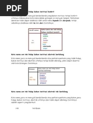 Contoh kata nama daripada jenis ini adalah seperti yang berikut: Contoh ayat kata nama am tak hidup bukan institusi abstrak. Yang bukan institusi tetapi konkrit sifatnya. Nama am kata ganti nama manusia manusia bukan manusia berbilang institusi tak . Sebagai contoh kata yang menamakan orang, tempat atau benda. Kata nama am abstrak atau konkrit? Kata nama am tak hidup bukan institusi abstrak berbilang. Banyak contoh kata nama am hidup bukan manusia yang boleh diberikan contoh. Kata nama jenis ini terdiri daripada perkataan yang merujuk badan atau institusi yang bersifat tidak hidup. Institusi atau bukan institusi, konkrit atau abstrak, berbilang atau tak berbilang. 2.2.5 kata nama am tak hidup bukan institusi abstrak berbilang
